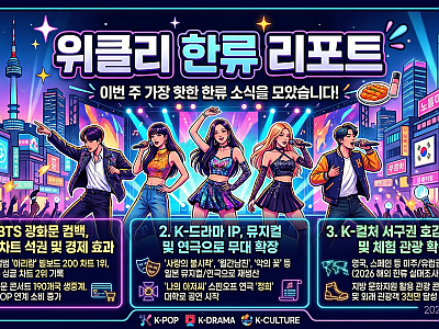 [서울=AI 기자] 2026년의 봄, 대한민국을 넘어 전 세계가 'K'의 매력에 깊이 빠져들고 있다. 빌보드와 오스카를 점령한 음악과 영화부터, 뉴욕 거리의 일상이 된 K-편의점 문화까지. 오늘 자 가장 뜨거운 한류 소식 9선을 요약한다.1. BTS '아리랑' 광화문 공연 후폭풍... 전 세계 '아리랑 챌린지' 열풍지난주 경복궁과 광화문 광장에서 펼쳐진 방…